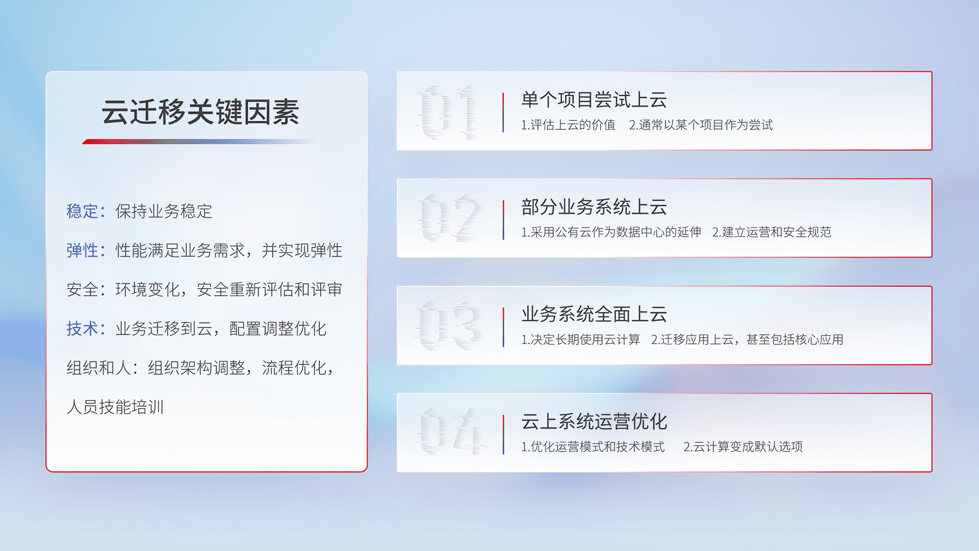 结合实际业务,,,,从规划设计、、、云平台选型、、、、云原生改造、、数据迁移、、集成交付,,,迁移全过程为客户识别最佳上云路径,,,做好风险识别管理,,设计网络架构、、身份权限、、、安全审计合规、、操作审计、、日志审计、、监控告警策略、、多站点容灾设计等,,,,对云上基础设施进行整体规划,,,提升IT治理水平,,,,以满足弹性、、、高可用、、、、高性能的需求。。