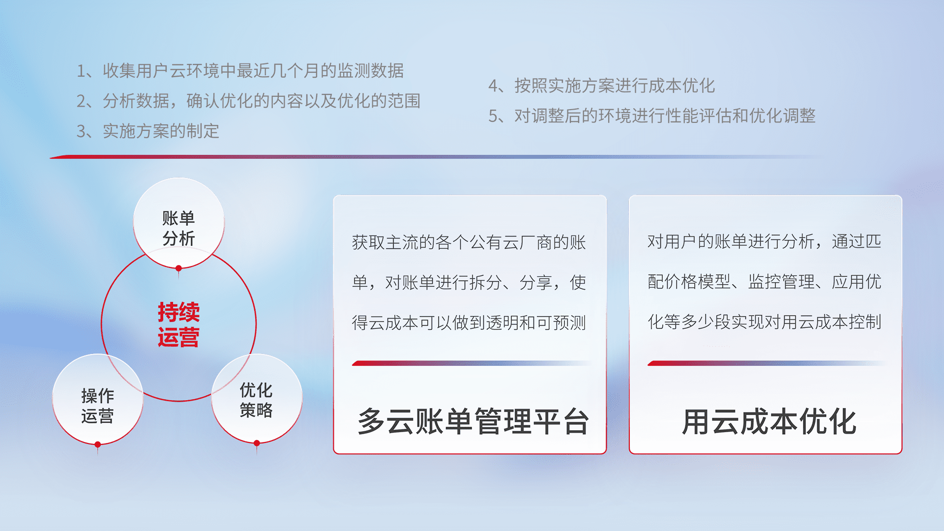 通过多云纳管,,以统一的资源数据模型把客户的云资源进行抽象和封装,,进而实现对多云资源的统一操作,,保障云资源管理的可靠性、、稳定性与可用性。。量身定制化运维内容,,,,配置、、、、开发运维、、、、补丁管理、、备份、、监控、、、认证和访问管理、、审计和日常巡检等,,,保障在用云过程中的可靠度,,,,稳定度以及高可用率。。