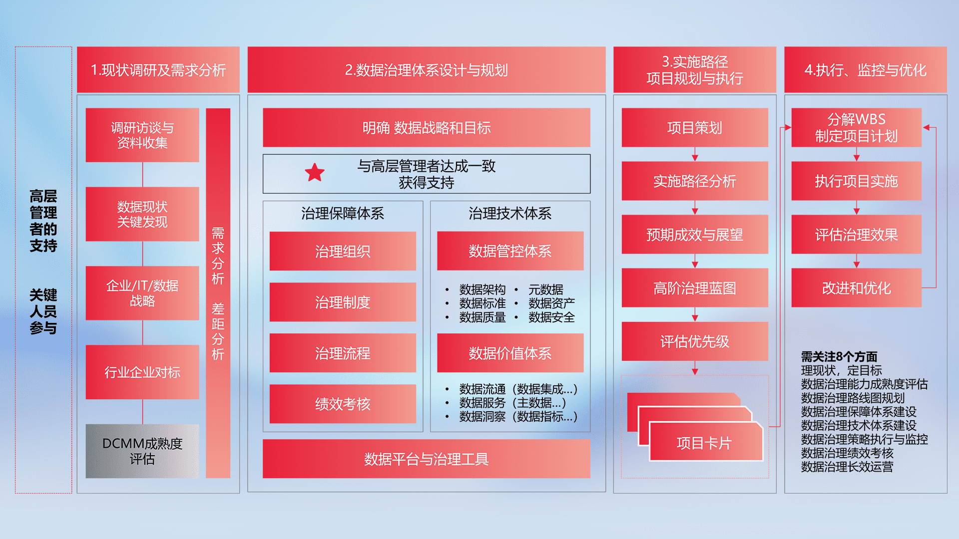 制定并执行统一的数据标准,,,规范数据定义和格式,,,消除冗余和不一致性,,,,实现跨部门和跨系统的数据一致性,,,为企业提供标准化的数据基础。。。